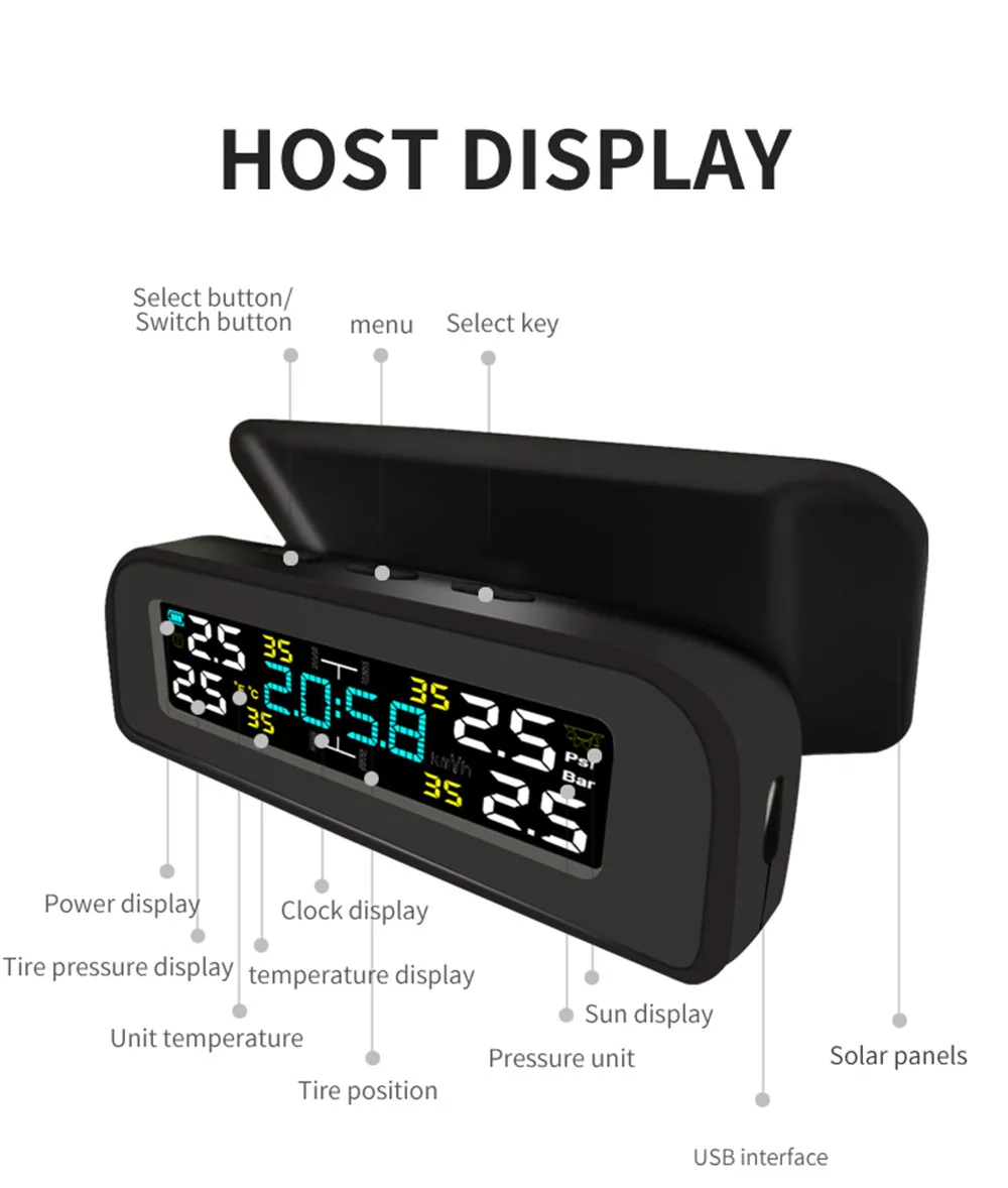 Universal TPMS Wireless Tire Pressure Monitoring System Solar Power Clock LCD Display 4 External Sensor Tire Pressure Sensors
